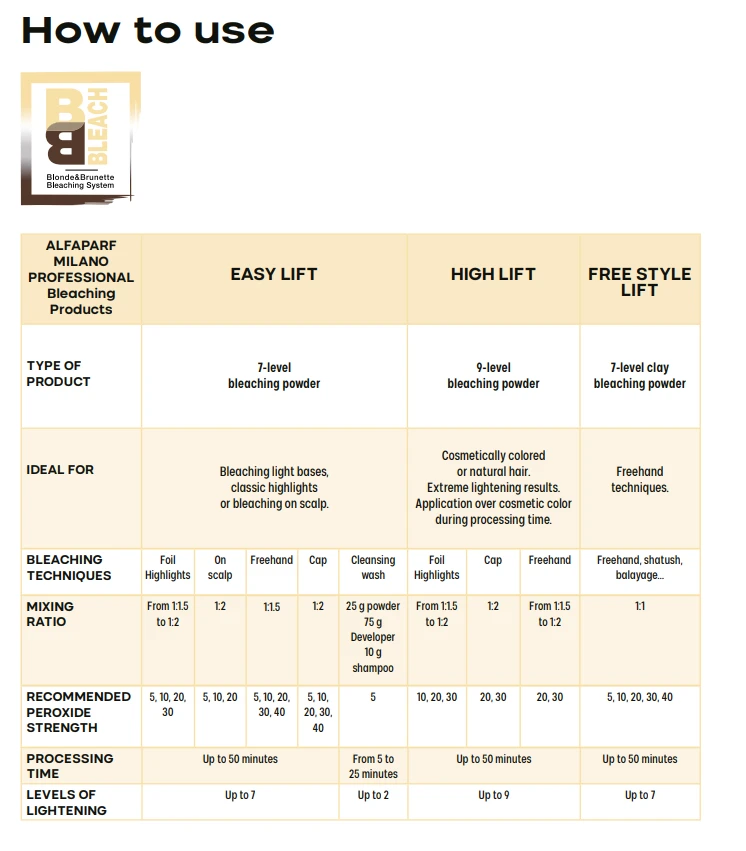 BB Bleach is a complete range of three bleaching powders, ideal for achieving the perfect lighten hair whatever the base. Features exclusive Bond Technology: repairs damaged areas of the hair for perfectly lightened results while protecting the fibre.