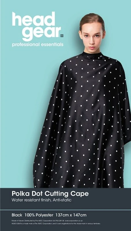 Head Gear Cape in black with white polka dots is 100% polyester, water resistant and features a snap fastener.