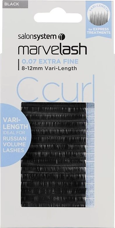 Marvelash C Curl Vari-Length lashes are mixed length across each strip allowing technicians to create a soft textured ‘Russian wispy’ look. Several lengths of lash can be picked up at once enabling fans to be created quickly and easily. Ideal for multi-lashing.