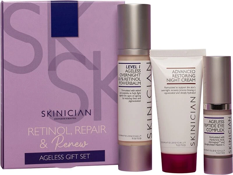 The set comprises of an award-winning Overnight Retinol Powerbalm 50ml, a retinol serum containing 0.1% pure retinol and peptides that aid in diminishing fine lines, brightening the skin, and reducing pigmentation. Additionally, the set includes a Peptide Eye Complex 15ml, an eye cream formulated with peptides, vitamin C, and Broad Spectrum UV to protect against harmful UV rays while instantly reducing the appearance of fine lines and wrinkles. Lastly, the set contains a Restoring Night Cream 50ml that is a hydrating and nourishing night cream, supercharging your skin cells to fight the signs of ageing and leave your skin glowing.
