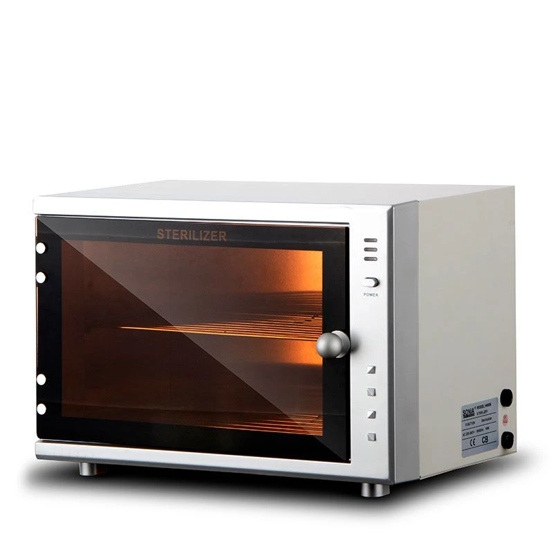 A high quality cabinet with UV light for an optical sterilization of instruments, brushes, tools, scissors and dry towels.