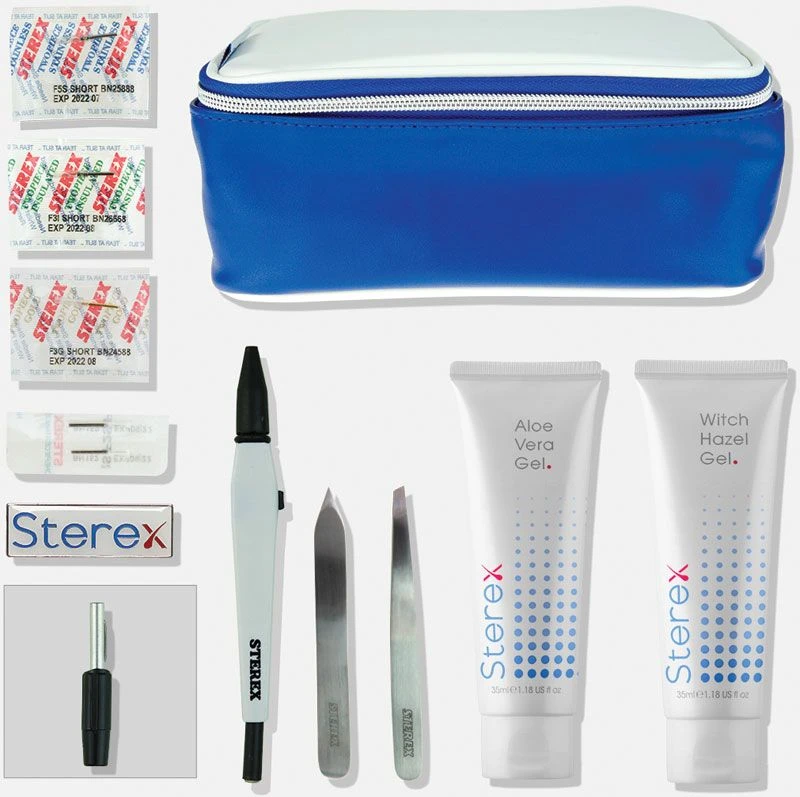 Contents: Sterex Bag, mixture of Needles (25), Aloe Vera Soothing Gel 35ml, Witch Hazel Soothing Gel 35ml, Sterex Badge, Tweezers (2) and Banana Switched Needleholder.